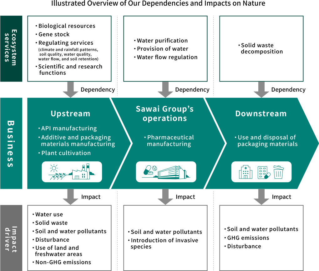 The ENCORE assessment indicates that, from the perspective of direct relevance to the Group, the pharmaceutical manufacturing process is closely related to water resources due to the risk of pollutant discharge from it and its need for clean water resources. Indeed, within the Group's pharmaceutical manufacturing process, we strive to monitor the water withdrawal and discharge and to appropriately manage substances that could cause water or air pollution, recognizing likely impacts of our water withdrawal and pollutant discharge on nature. Also, since pharmaceutical manufacturing requires raw materials and packaging materials derived from plants, animals, and petroleum, we depend on natural resources themselves and on the ecosystem services, especially the natural regulation of climate and environmental conditions for resource production. Based on the ENCORE analysis results and the Sawai Group's actual condition, among our relationships with nature, we consider the relationships with these kinds of resources to be of particular significance in our examination of nature-related issues.