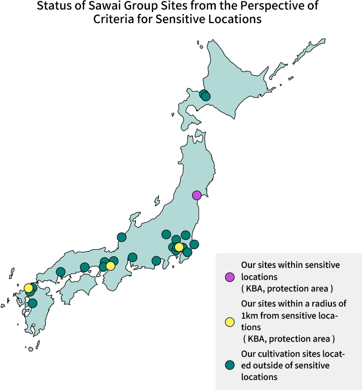 Among the Sawai Group-owned sites, the survey has located one branch office in Sendai within a wildlife protection area and two other branch offices in Tokyo and Fukuoka, as well as a branch office and sales office housed in the same building in Osaka, close to a wildlife protection area or a KBA.* Serving primarily as sites for office functions such as sales and product management, these locations are negligibly related to activities involving the use of major natural resources other than supply water and sewage services or the discharge of environmental pollutants, suggesting that the degree of their dependencies and impacts on nature is lower than those of manufacturing sites. Also, the survey has found that none of the Group's pharmaceutical manufacturing sites constitute sensitive locations.
