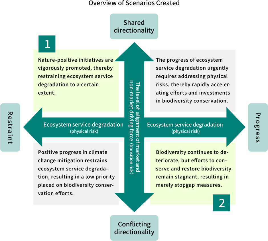 We employ a scenario analysis approach to evaluate and organize our risks and opportunities, thereby assessing their importance. The TNFD’s guidance on scenario analysis recommends a 2×2 critical uncertainties matrix, which is divided by two axes, one indicating transition risks and the other indicating physical risks, into four quadrants, in each of which is a future scenario. In creating scenarios, following a recommendation given in the guidance, we used two indicators for the level of uncertainties: the level of ecosystem service degradation and the level of alignment of market and non-market driving forces. We then placed various elements along the two axes in consideration of the Group's business condition and used the results to consider what would occur in each of the four scenarios created in the relationship between the two axes.